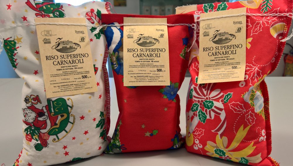 Il nostro riso Carnaroli confezionato in tela natalizia.